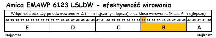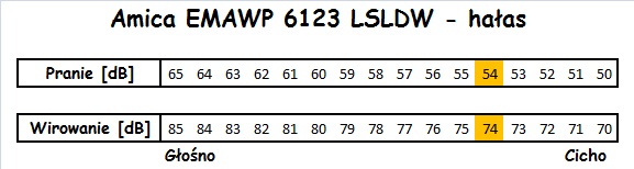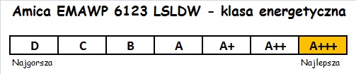 Amica EMAWP6123LSLDW pracuje w klasie energetycznej A+++, a więc obecnie w najwyższej możliwej, co oznacza niskie zużycie prądu. Hałas na poziomie 54 dB podczas prania i 74 dB podczas wirowania oznacza, że pralka jest stosunkowo cicha.